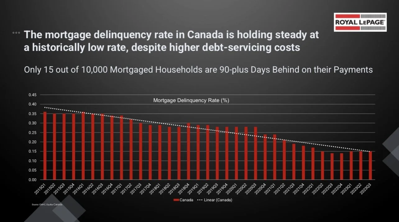 3. Low Mortgage Delinquency Rate: Despite higher debt-servicing costs, Canada maintains a historically low mortgage delinquency rate. A mere 15 out of 10,000 mortgaged households are 90+ days behind on payments, highlighting the resilience of the real estate sector.